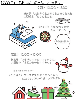 12/7(日)12:00~13:30 あたるかな!?つれるかな!?(さかなつりとまとあてゲームであそびます)12/7(日)15:00~16:00 クリスマスかざりをつくろう(ツリーやタンバリンをつくります)